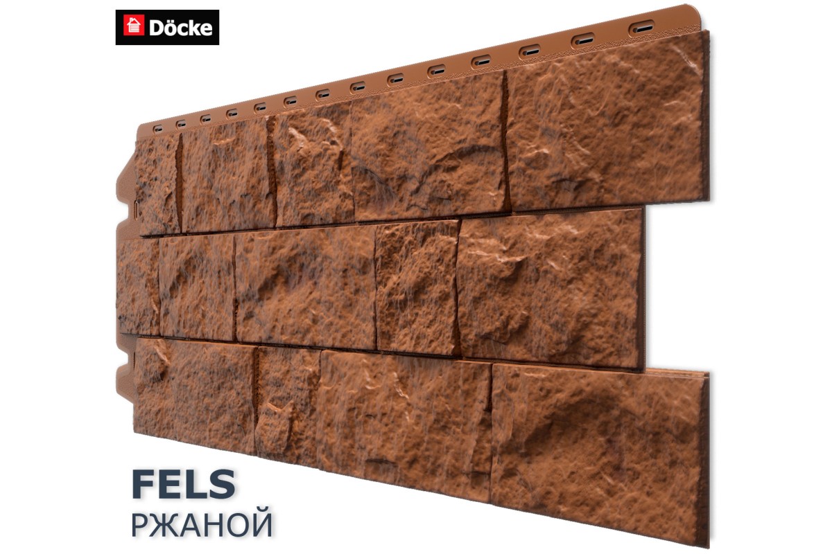 Фасадная панель Деке Премиум FELS Фелс Ржаной — выразительное решение для облицовки, достоверно воссоздающее текстуру дикого скального тёсаного камня. Насыщенный рыже‑коричневый тёмный оттенок в сочетании со швами в тон придаёт фасаду глубину и характер, а имитация крупного камня добавляет объём и рельефность. Такой дизайн привносит в облик здания теплоту и природную основательность, идеально вписываясь в стилистику рустика, кантри, эко‑архитектуры, а также в современные композиции с акцентом на натуральные фактуры.