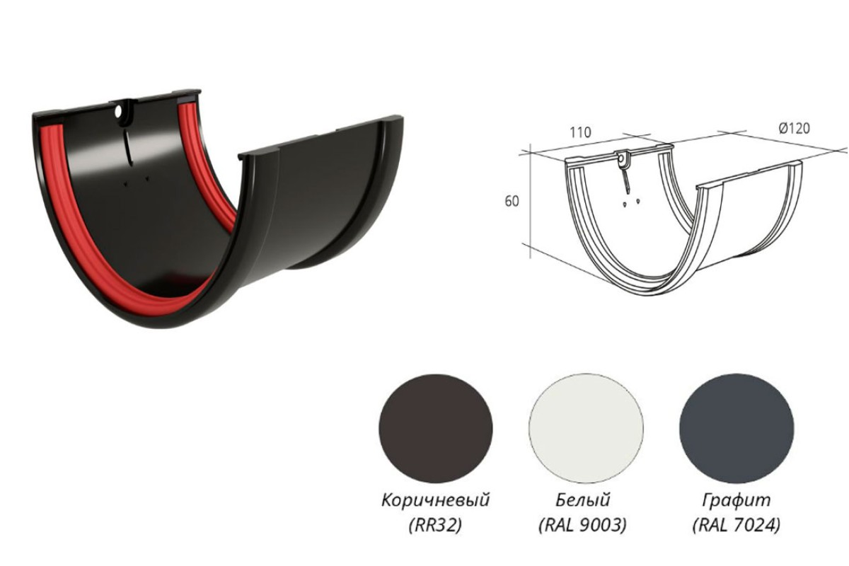 Соединитель желоба из ПВХ используется для надежного соединения двух секций водосточного желоба. Он обеспечивает герметичность стыка, предотвращая утечку воды, и придает конструкции дополнительную прочность. Соединители из ПВХ устойчивы к коррозии, ультрафиолетовому излучению и механическим повреждениям, что делает их долговечным элементом водосточной системы.
